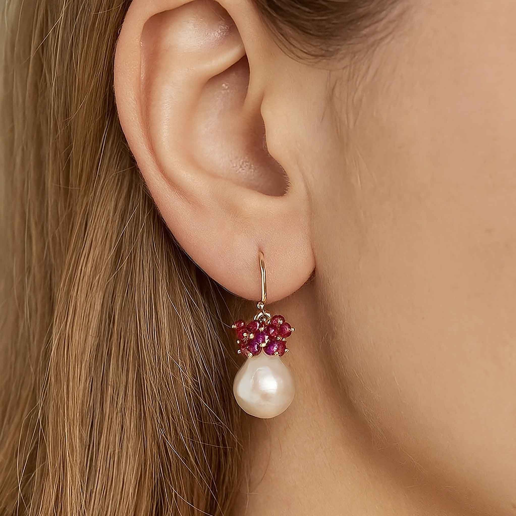 These baroque pearl earrings are all dressed up wearing a cluster of tiny ruby beads on yellow gold earring hooks. Pearl shapes may vary slighlty