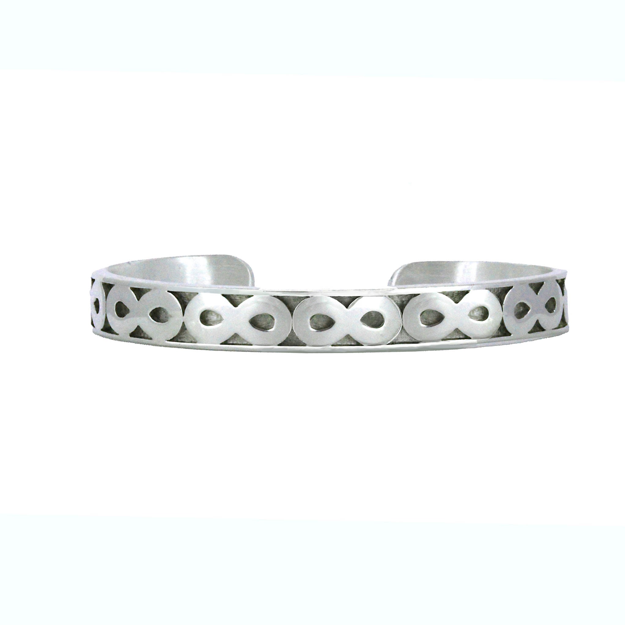 A solid sterling ilver open cuff embedded with the infinity symbol.